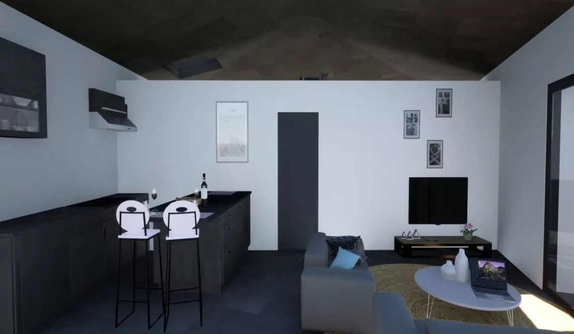 pièce de vie sud de 35,62 m² avec sa cuisine, cellier à l'entrée,