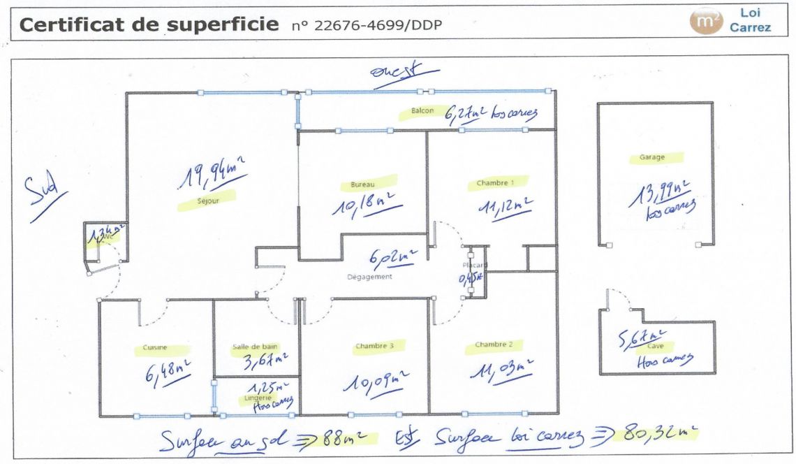 spacieux et lumineux type 4/5 de 88 m² habitable au sol (loi carrez de 80,32 m²) en très bon état général,