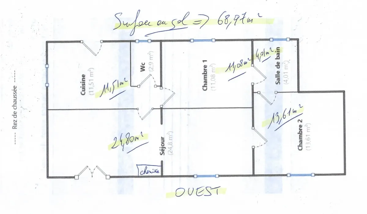 D'une surface d'environ 70 m² habitables, elle propose une agréable pièce de vie de 25 m², deux chambres,