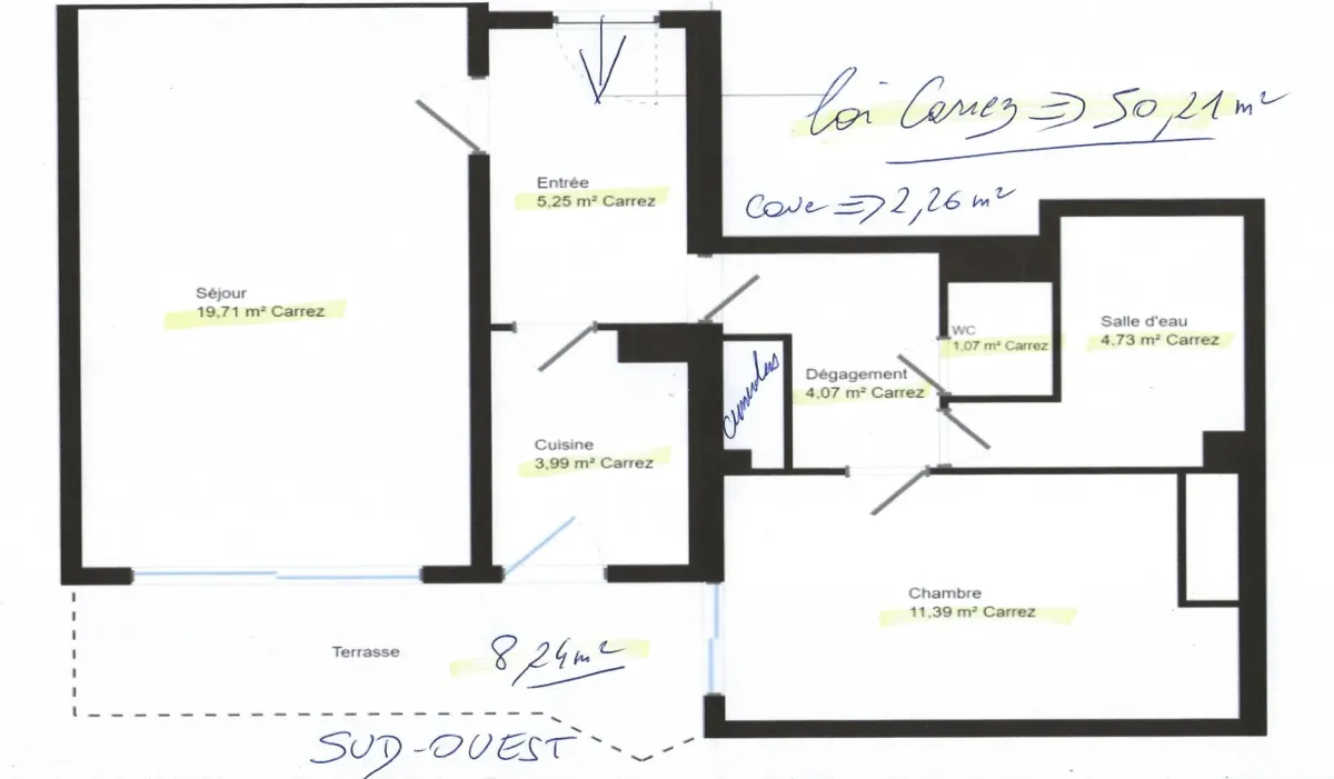Salle d’eau refaite, WC séparés, cuisine indépendante entièrement équipée de 4 m² (possibilité d’ouverture sur le séjour).