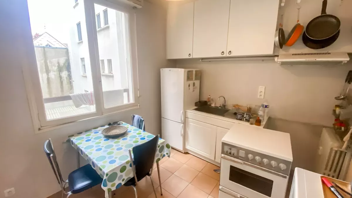 d’une cuisine indépendante, et d’un espace nuit comprenant une grande chambre de 15 m² avec sa salle de bains attenante.