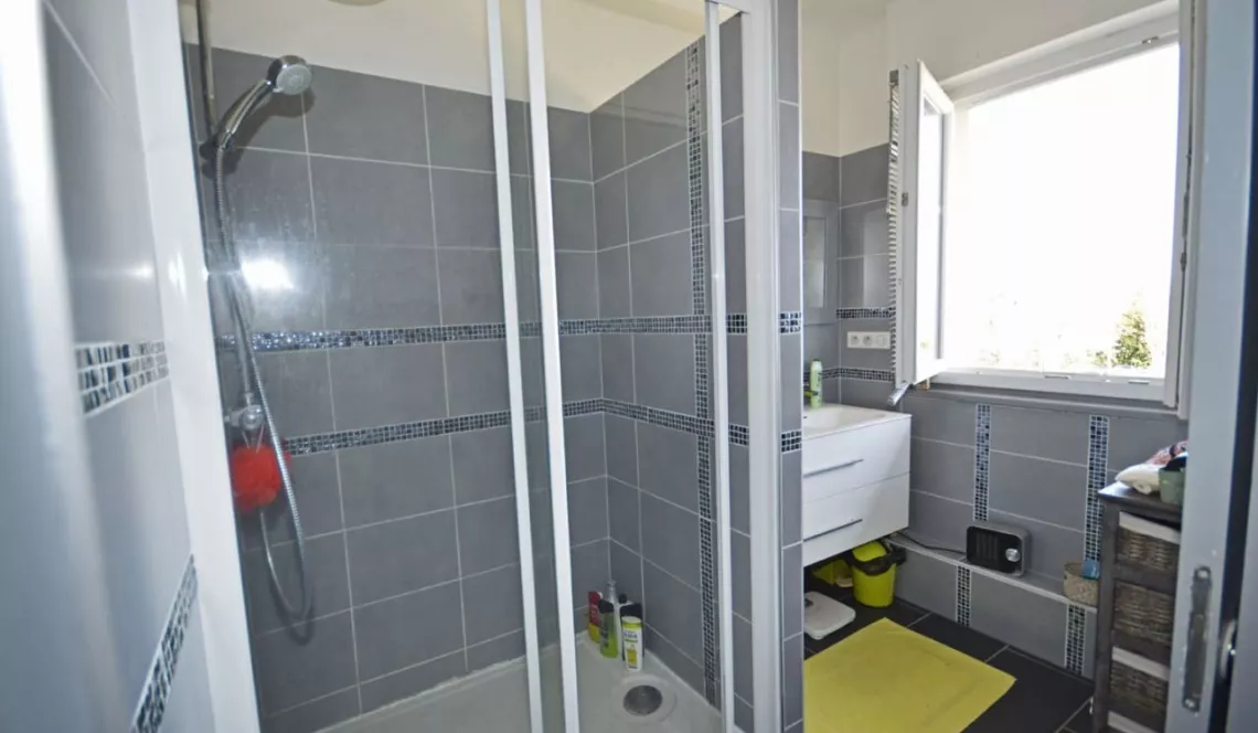 Salle d'eau avec douche à italienne, wc séparé, cuisine équipée, cave.