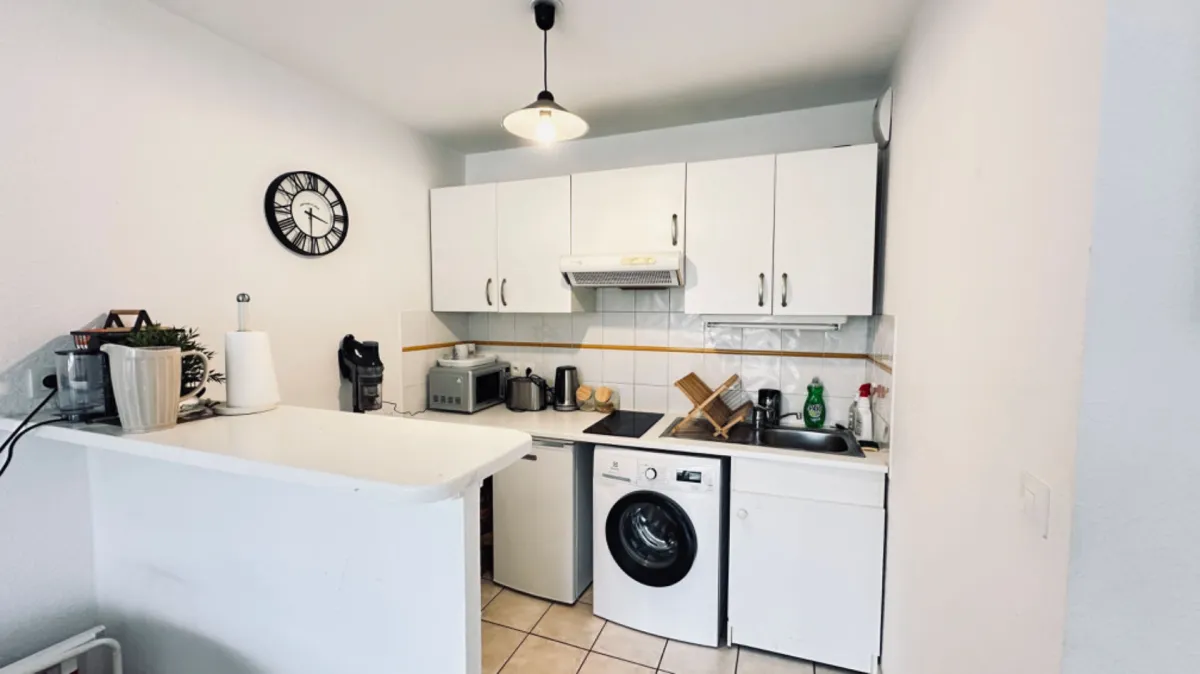 Dès l’entrée, vous accédez à une agréable pièce de vie avec cuisine ouverte, offrant un espace fonctionnel et convivial.