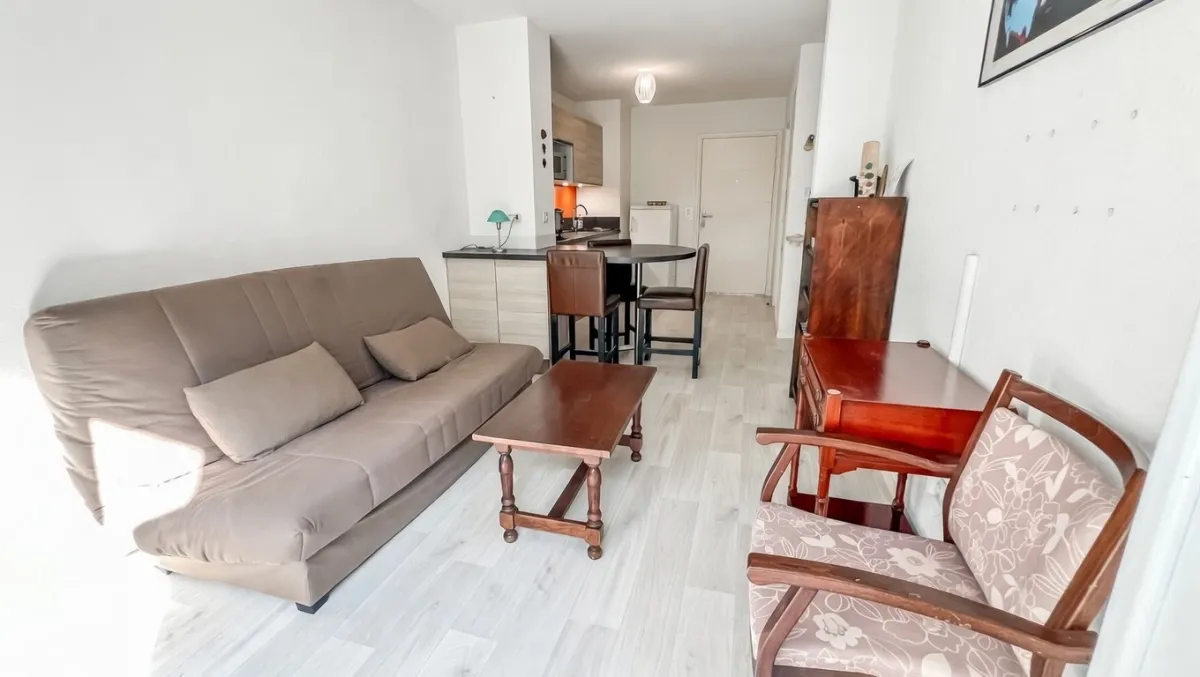 L’appartement offre un séjour lumineux avec cuisine équipée, complété par un cellier attenant, idéal pour le rangement.