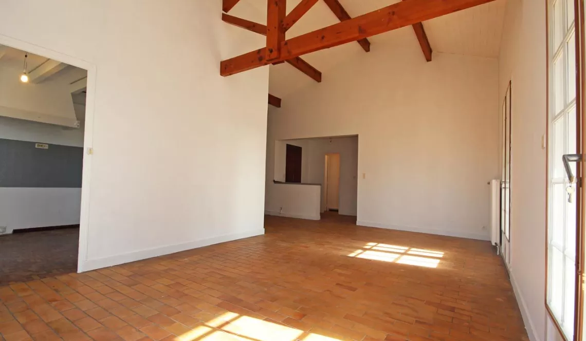Séjour avec cheminée et plafond cathédrale, cuisine indépendante qui peut être ouverte et garage attenant de 35 m² et combles aménageables.
