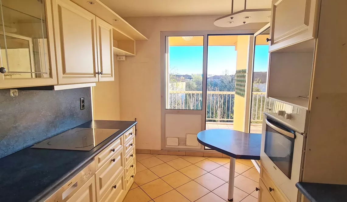 Cuisine séparée de 11,60 m², ouvrant sur la terrasse avec vue sur parc