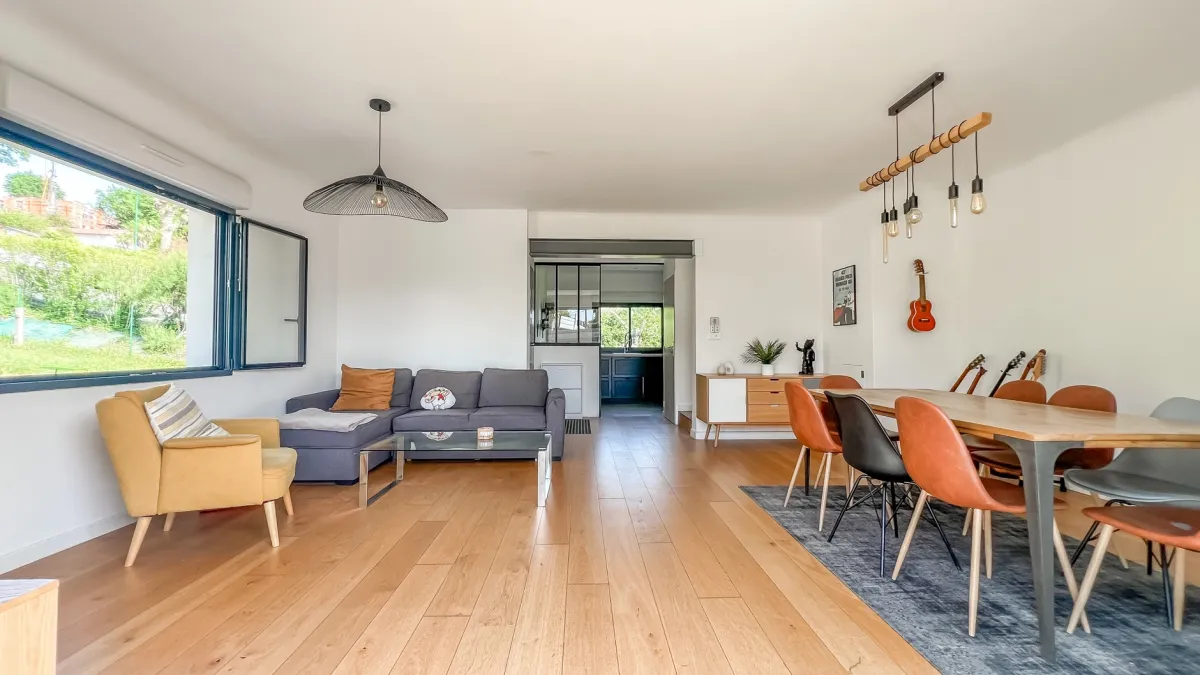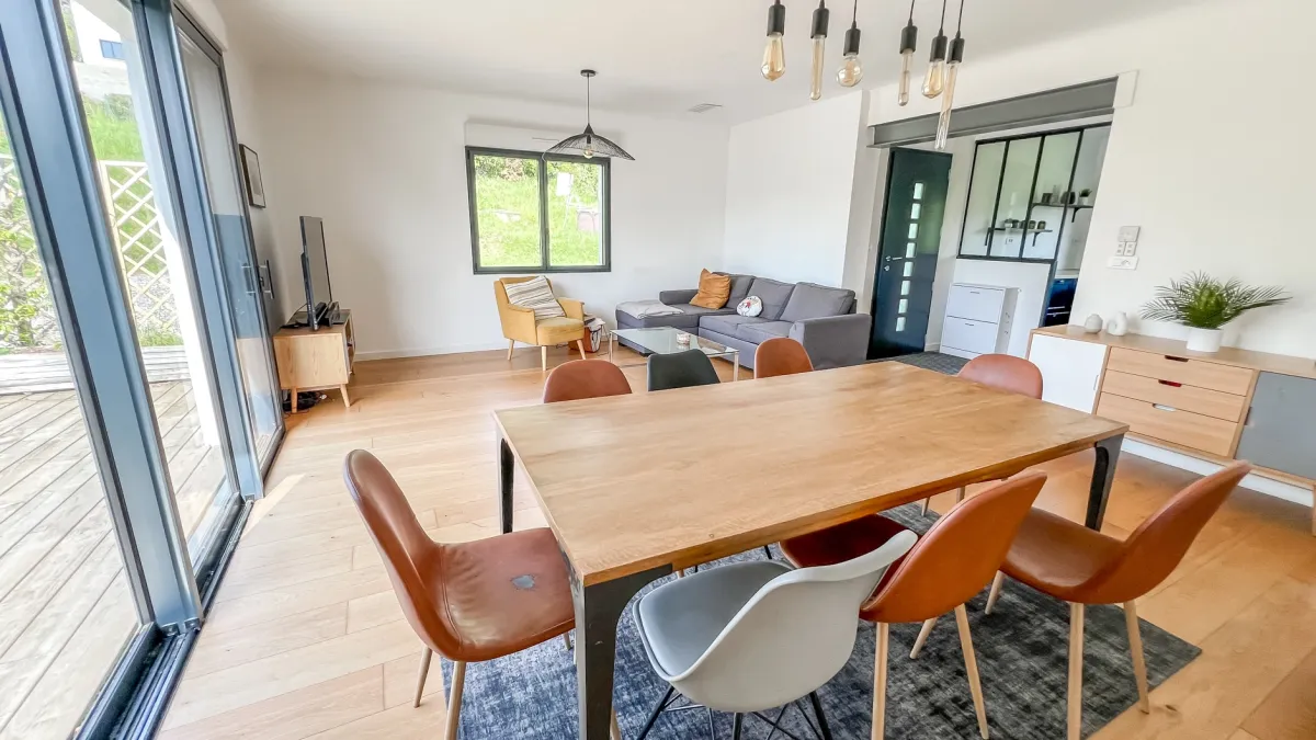 La maison propose un séjour lumineux ouvrant sur une terrasse ensoleillée, ainsi qu’une cuisine équipée et fonctionnelle.